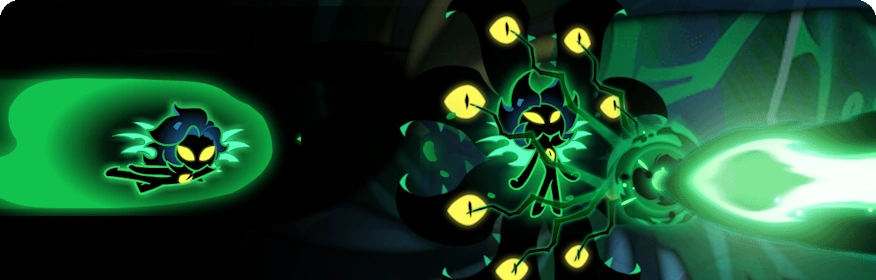 Channels the darkness at certain intervals, absorbing nearby obstacles and Jellies alike, and creating Deep Sea Crystal Jellies. After obtaining a certain number of Deep Sea Crystal Jellies, the darkness transforms the Cookie, who starts flying forward while creating more darkness. After flying for a certain period of time, the darkness fades, causing the Cookie to return to normal, and gathering all the Deep Dark Energy into an energy beam. Level Up for more points for Deep Sea Crystal Jellies, more Dark Energy Beam Points, and more Dark Energy Beam Finish Points.