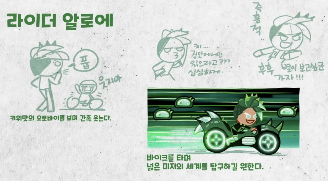 According to Aloe Cookie's designer, M,[1] she was originally intended to be a biker who explored unknown lands. However, as Cyborg Cookie and Ion Cookie Robot were being developed, Aloe Cookie got redesigned as a researcher and became part of the "Cyborg Menace" update.