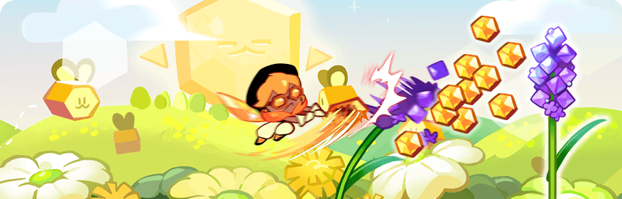 Enters a field of flowers at given intervals. The flowers grow to varying heights while the Slide button becomes a Honeydipper Staff button. Reach the flowers at the correct height to strike the flowers with the Cookie's Honeydipper Staff. After each strike, large amounts of pollen are released from the flower and Honey Crystal Jellies are created. Level Up for more points for Honey Crystal Jellies.