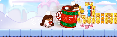 Knitaholic Costume equipped, Cocoa Cookie only has a single standard line that doesn't mention cocoa in it, and this line still pertains to putting marshmallows into cocoa. - Cocoa Cookie makes sure not to spill her cup of cocoa even while double jumping. She just jumps again in the air without flipping around.
