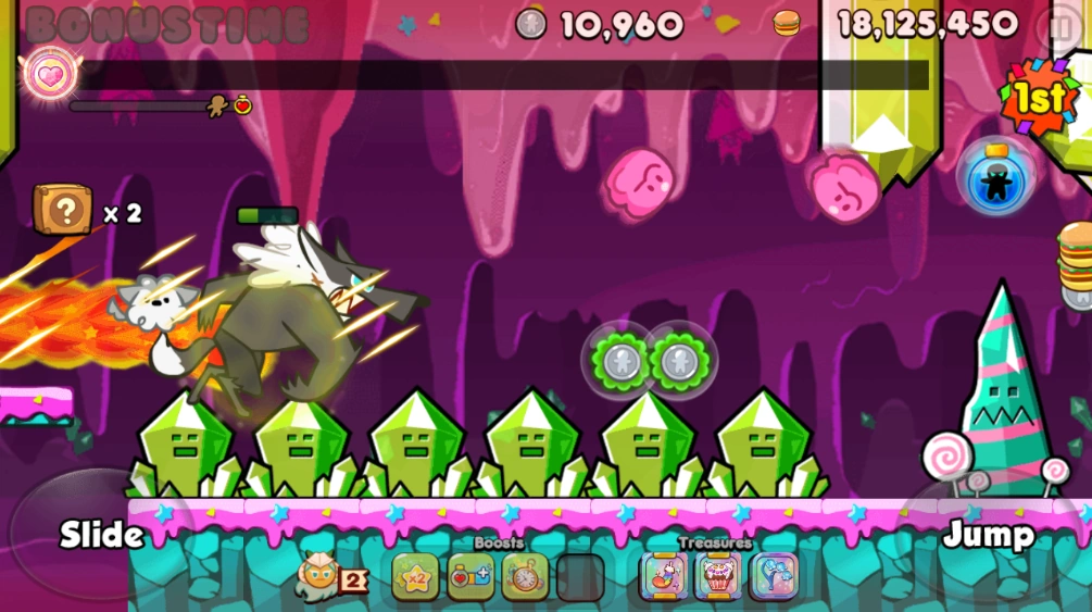 Also known as "double-tapping," this technique is really useful in many ways, especially in some floors of Tower of Frozen Waves in Line/Kakao Cookie Run and some Cookies such as Lime Cookie, Roll Cake Cookie, and Skating Queen Cookie. However, players need to know when exactly to execute this technique, as some hanging obstacles can cause the player to collide when using this technique and not the usual single jump. This is because double-tapping can make the Cookie go slightly higher than a single jump.