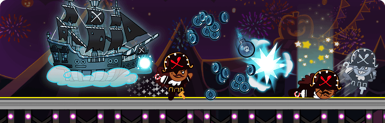 Summons his pirate ship at certain intervals. The ship fire cannonballs to destroy obstacles and create Ghost Coins. After running out of Energy, Pirate Cookie will revive himself as a Ghost Pirate one time. As a Ghost Pirate, he can pass through all obstacles but cannot collect Energy Potions. Level Up for more points for Ghost Coins and more starting Energy in Ghost Pirate form. (Pirate Cookie can magnetically collect Pirate Coins that appear in the Black Sugar Pirate Ship.)