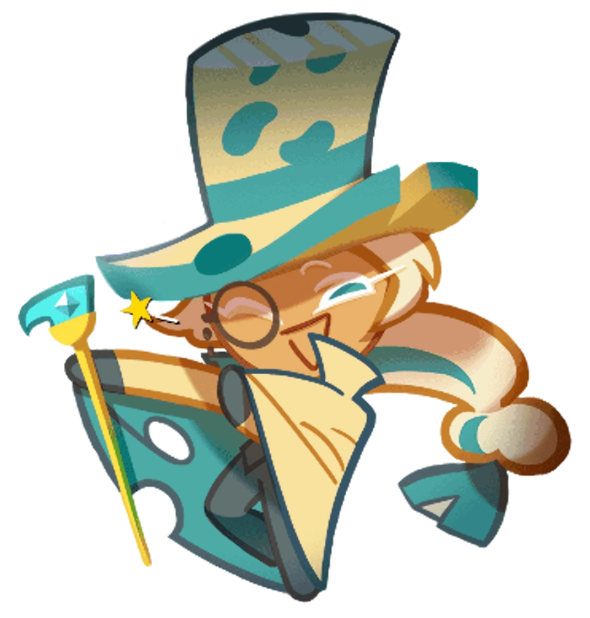 Armed with an air of refinement and elegance, this mysterious Cookie's fatal charm can steal hearts with just a mere glimpse. Some Cookies find themselves looking forward to receiving a calling card! A meticulous planner and unpredictable trickster, Roguefort Cookie is able to appear and disappear within the blink of an eye.
