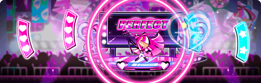 Holds a concert at certain intervals. As she steps onto the stage, blue and pink rhythm notes gradually appear from the edges of the screen and travel towards the stage. Tap on the needed color rhythm note at they approach circle. Pressing the correct color will grant points. A total of 12 rhythm notes will appear. Once all the notes have either appeared or have been collected, Shining Glitter Cookie will finish the concert with Fever Time for a short duration. During Fever Time, the circle will flash repeatedly. Rapidly tap the buttons to earn extra points. Level Up for more Rhythm Note Points.